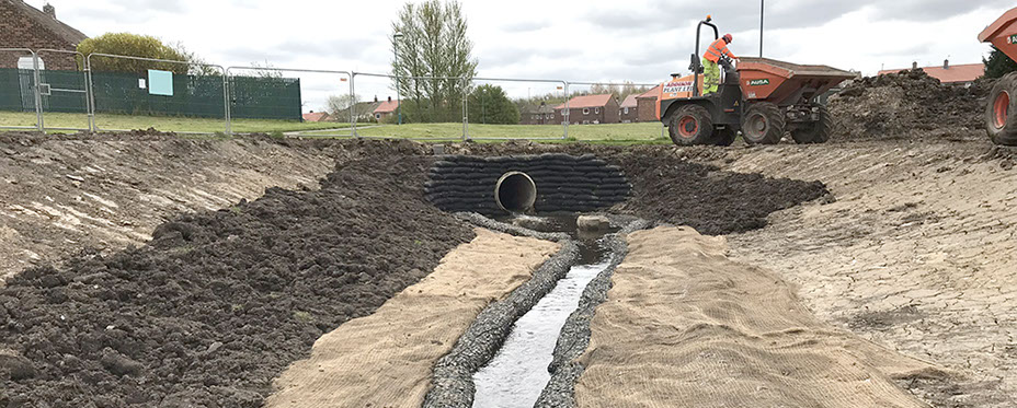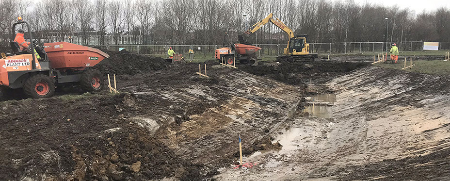 PROJECT SUMMARY Monkton has been subject to numerous recent flood events. To address flooding risk localized surface water management solutions are proposed at a number of at risk areas to provide a catchment-wide solution. Addison Plant was employed as the Main Subcontractor on site employing and managing other subcontract packages such as surfacing and fencing. We prepared and issued RAMS and daily briefings to all parties. We carried out: • Earthworks of new Swale and balancing ponds with 20,000m3 of disposal off site • New bunds on flood plane area • Installation of super gullies, which were first in the north east working with Stanton Bonna • Filter drains and precast headwalls with stone pitching • New pin kerbs and road kerbs, re profiling existing carriageway • Excavation around services carried out by vacuum excavation and by hand due to the amount of existing services Approx. 250 service crossings • Building of 1800mm dia MH’s onto existing pipework at 6m depth • Flow control manholes using orifice plates • Installation of hydro brakes in Manholes up to 3 metre dia on 900mm pipe • Reinstatement of roads with temporary reinstatement planed out and a stepped joint constructed • 522 metres of 500mm dia pipe in carriageway • 232 metres of 600mm dia pipe in verge • 190 metres of 450mm dia pipe surface water diversions • 500 metres of gully runs 150mm and 225mm dia pipe • Top soiling and seeding • Fencing post and rail • New footpaths around ponds We carried out pedestrian management with temporary footpaths/ramps and signage on site all to the satisfaction of South Tyneside Council.