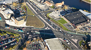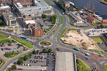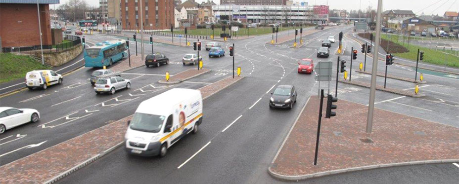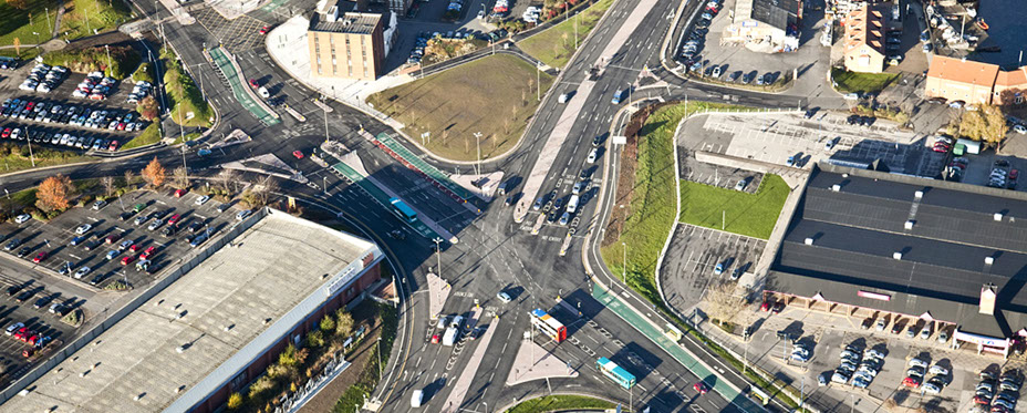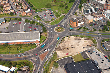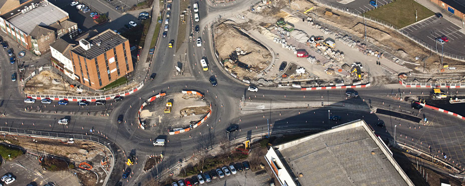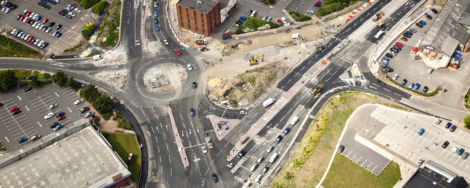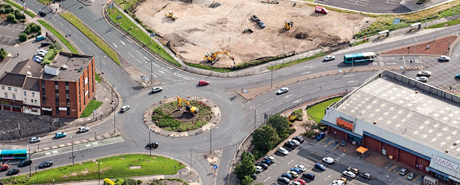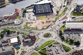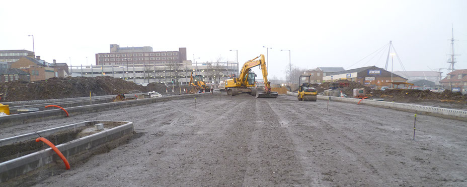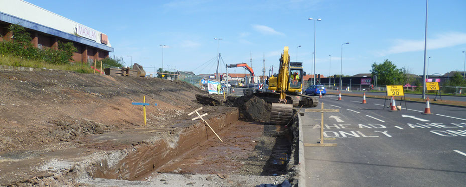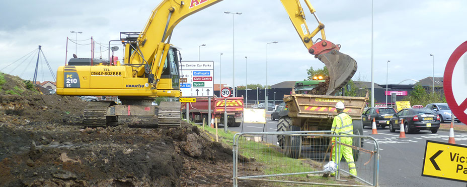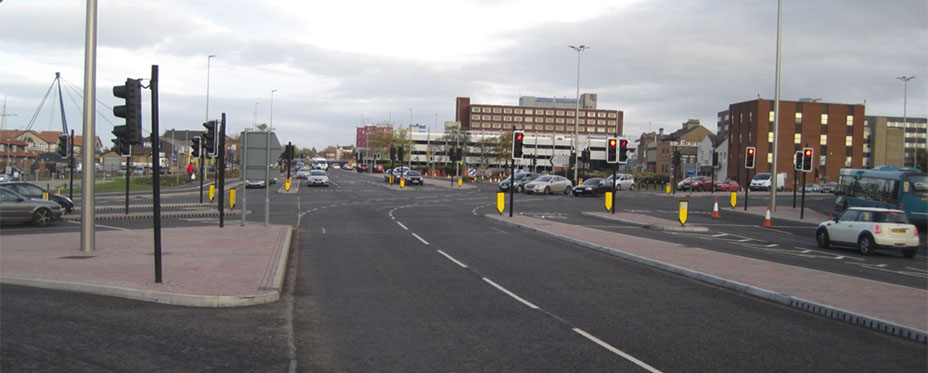 PROJECT SUMMARY This scheme was to construct two new linked signal-controlled junctions to take the place of a roundabout in order to improve traffic flow through the junction. It also covered the realignment of Riverside Road in order to straighten out its connection with 1825 Way. Our work included: An 8 week program of night shifts to install all road crossings for drainage and ducts. We carried out a topographical survey and outlined the earthworks strategy to eliminate disposal of arisings off site. This involved excavating 6000m3 of class U1A and the reuse of it as class 1/2 acceptable material as fill in road embankments. There was also 1000m3 of excavated material which required disposal off site. We imported 5000m2 of 6F5 and sub base for roads and footpaths which was all trimmed to tolerances ready to receive tarmac. We installed 700m of drainage up to 4m deep including connections to Northumbrian water sewers to adoptable standard. To service the new road layout we also had to lay 2000m of traffic signal and road lighting ducts.