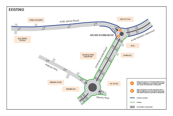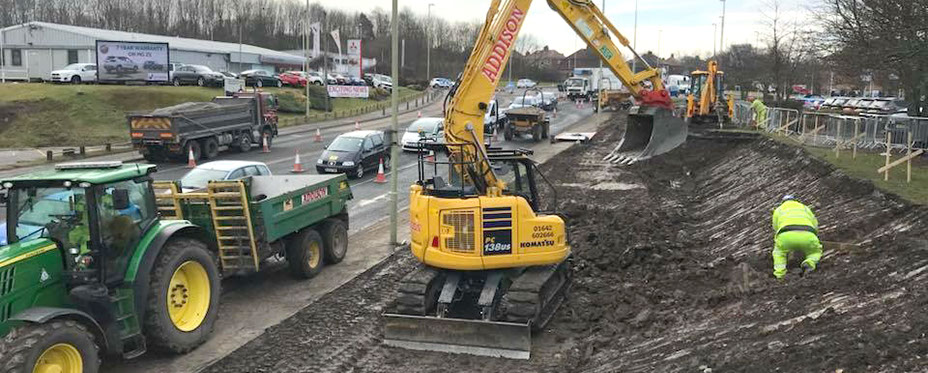 PROJECT SUMMARY Addison Plant worked as a sub-contractor to Galliford Try to convert the Arches roundabout to a traffic signal junction and create a new link road between Hobson Way and A185 Jarrow Road. The A194/Hobson Way/Elswick Way Roundabout was also converted to a traffic signal junction with the A194 Newcastle Road being widened to accommodate two right-turn lanes onto Hobson Way. • The contract involved working in restricted Traffic Management hours to remove existing footpaths and saw cut existing roads. Excavate to formation level, excavate box-cuts and fill with stone for road widening. • Carrying out CBR tests. • Installation of temporary footpaths for diversion works. • Re – profiling existing batters and stabilising works due to new gradients. • Earthworks through 9000m3 of brown field areas, removal of contaminated spoil off site. • Topsoil of batters and other areas for new road and footpath. • Install new drainage 150mm dia up to 450mm. • Build new manholes and catch pits. • Connect into existing manholes up to 7 metre deep. • 30 metres of 300mm pipe jacking from 3 metre jacking pit to 7 metre reception pit with manholes on completion • Installing filter drains and attenuation tanks 30m x 3.5m x 3.5m deep. • Locating of existing services and moving over/lowering to accommodate new paths and kerbs. • Installing new T.S. ducting and S.L. with duct boxes and NAL sockets for new traffic signals.